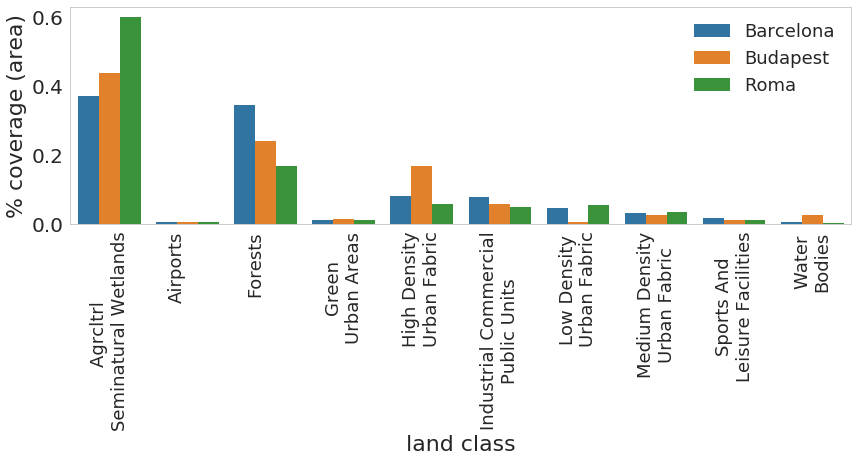 As expected, there is a large disparity in the classes, with a lot more land (by surface) classified as agricultural or forests as opposed to, e.g., airports. In the figure, we show the land use classes we analyze in the paper.